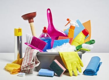 Cleaning equipment, containers and bins, detergents and cleaners, gloves, rags, brushes, etc.